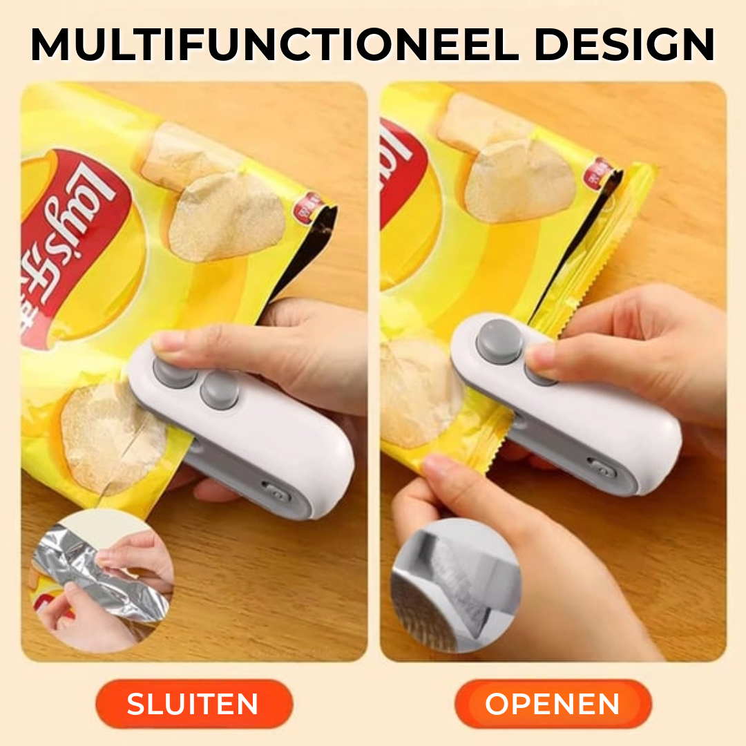 Deze compacte sluiter snijdt én verzegeltplastic zakken, van chips tot fruit, en is handiger dan clips – ideaal voor thuis of onderweg. Voel de voldoening van een veelzijdig hulpmiddel dat je keuken netjes houdt en je favoriete snacks langer vers bewaart – een slimme keuze voor iedereen!