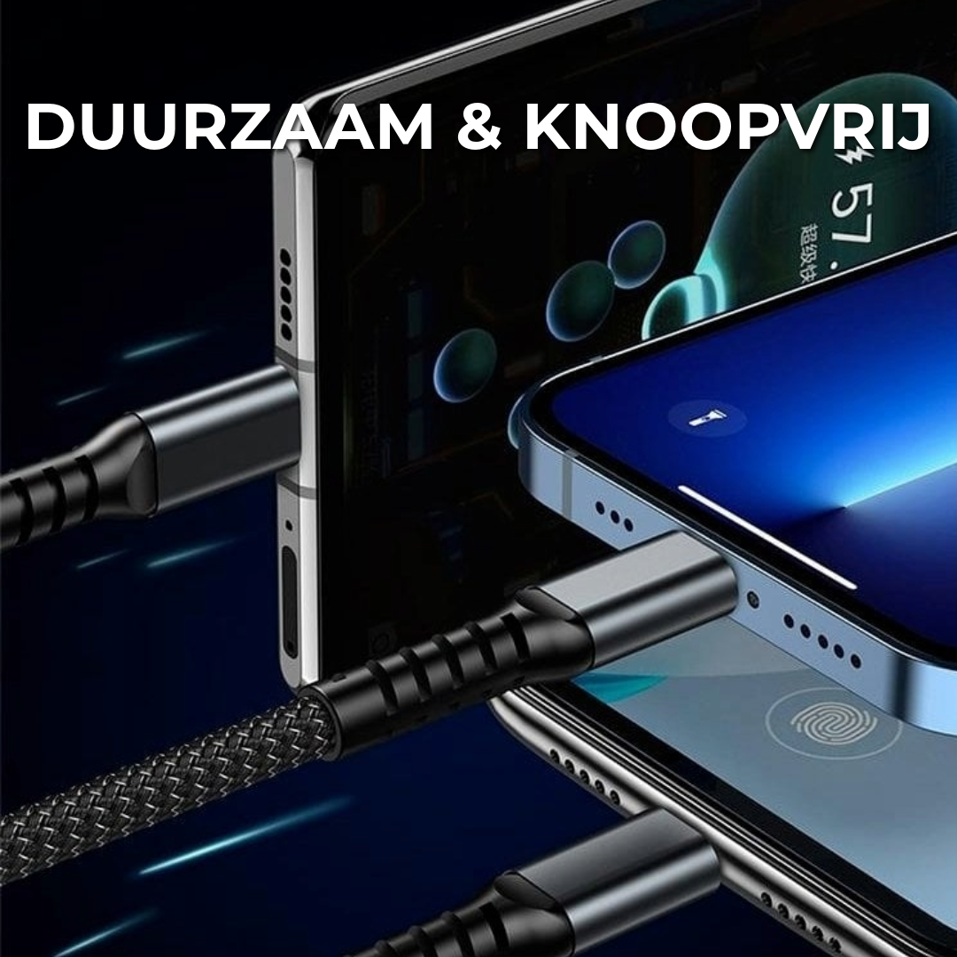 Of je nu een USB-C, Lightning of Micro-USB nodig hebt, deze kabel heeft het allemaal. Geen gedoe meer met verschillende kabels – laad je telefoon, oordopjes en powerbank tegelijk op. Perfect voor gezinnen, op kantoor of onderweg. Één kabel, eindeloze mogelijkheden!