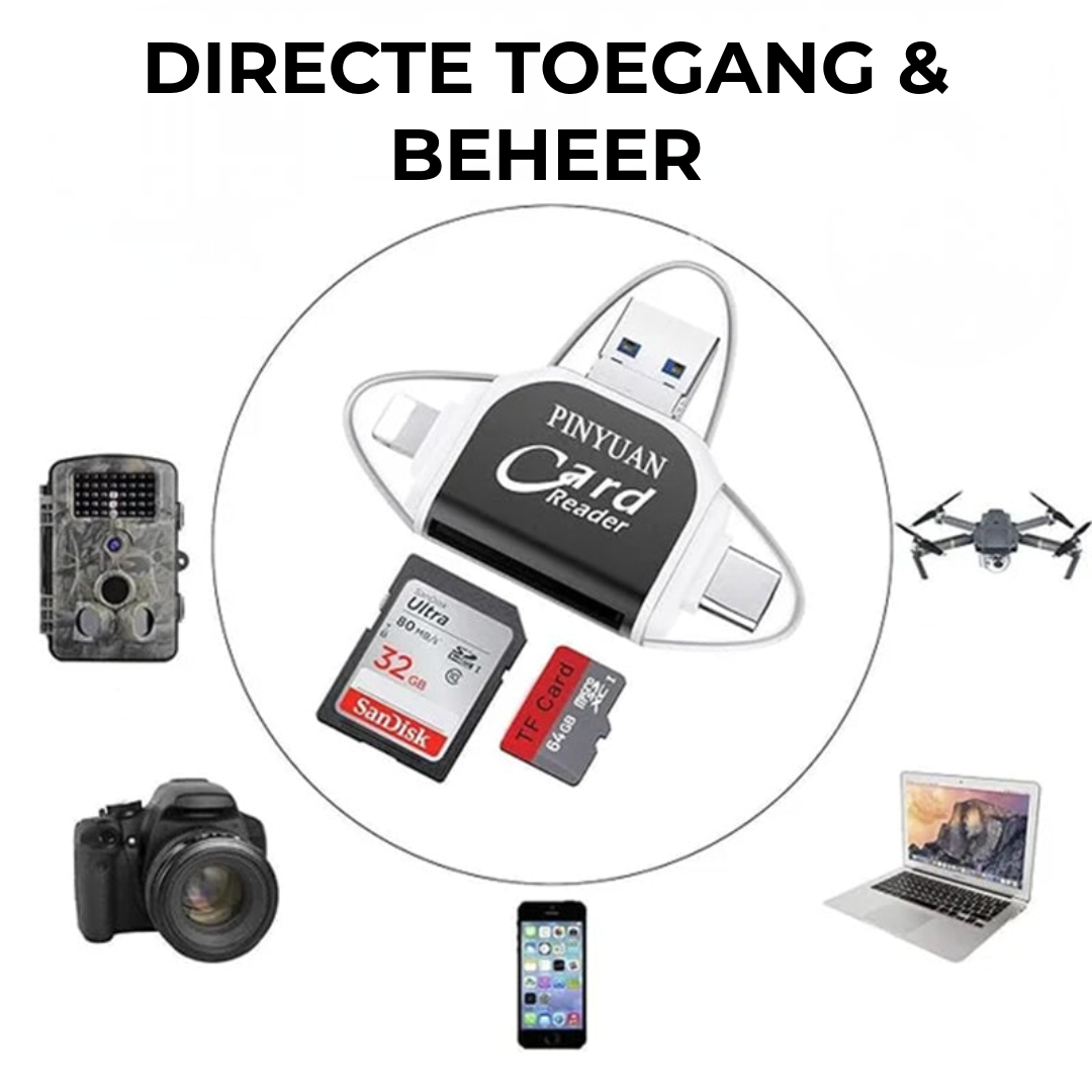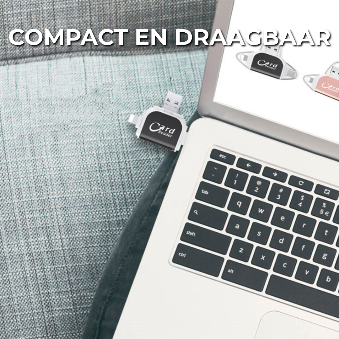 Met de 4-in-1 universele SD/TF-kaartlezer deel en beheer je moeiteloos bestanden tussen al je apparaten. Dankzij de veelzijdige aansluitingen – USB, USB-C, micro-USB en Lightning – is hij compatibel met vrijwel elk apparaat, van iPhones en Android-telefoons tot laptops en tablets. Snel, compact en altijd binnen handbereik!