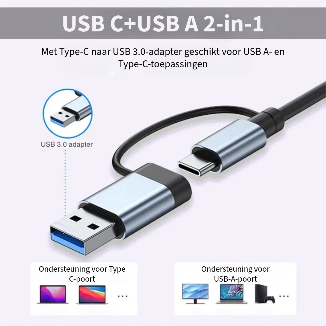 et de 8-in-2 USB-hub maak je in één beweging verbinding met al je apparaten. Dankzij de USB A, USB C en kaartlezers heb je alles wat je nodig hebt binnen handbereik. Deze compacte hub combineert snelheid, eenvoud en compatibiliteit, ideaal voor iedereen die efficiënt en georganiseerd wil werken.
