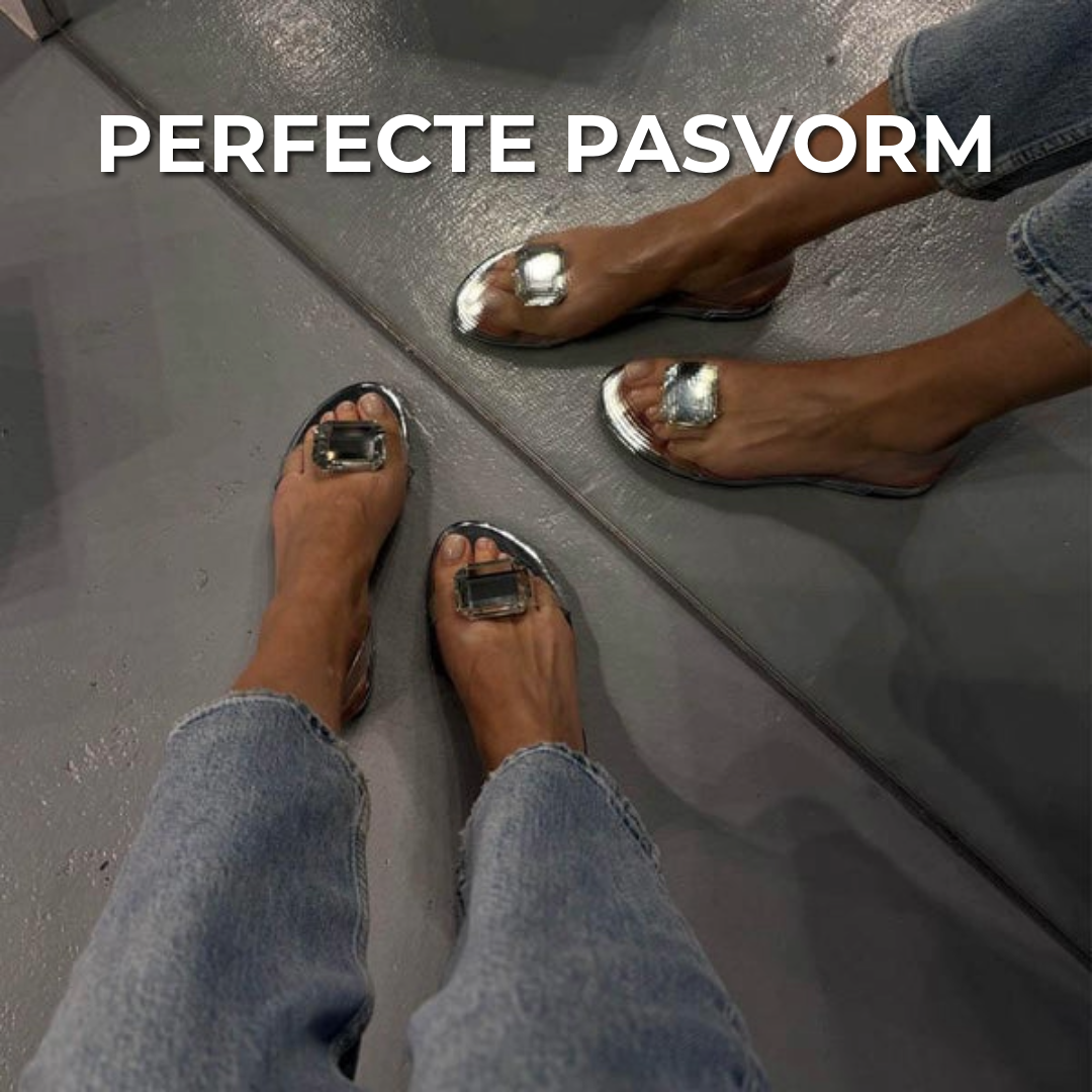 Dankzij de slip-on stijl met verstelbare hielband zitten deze sandalen stevig en comfortabel aan je voeten, zonder dat je hoeft in te leveren op stijl. De transparante look met de glinsterende steen maakt ze tijdloos en verfijnd.
