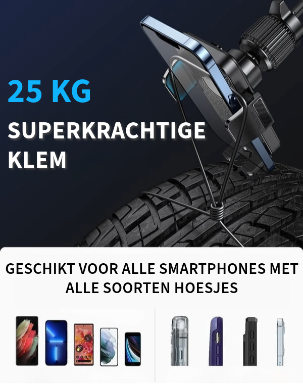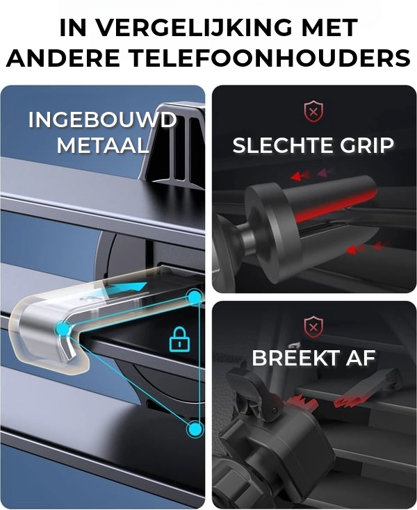 De krachtige klem, die gemonteerd wordt op uw ventilatieroosters, houdt je telefoon stevig vast, zelfs op de meest hobbelige wegen.