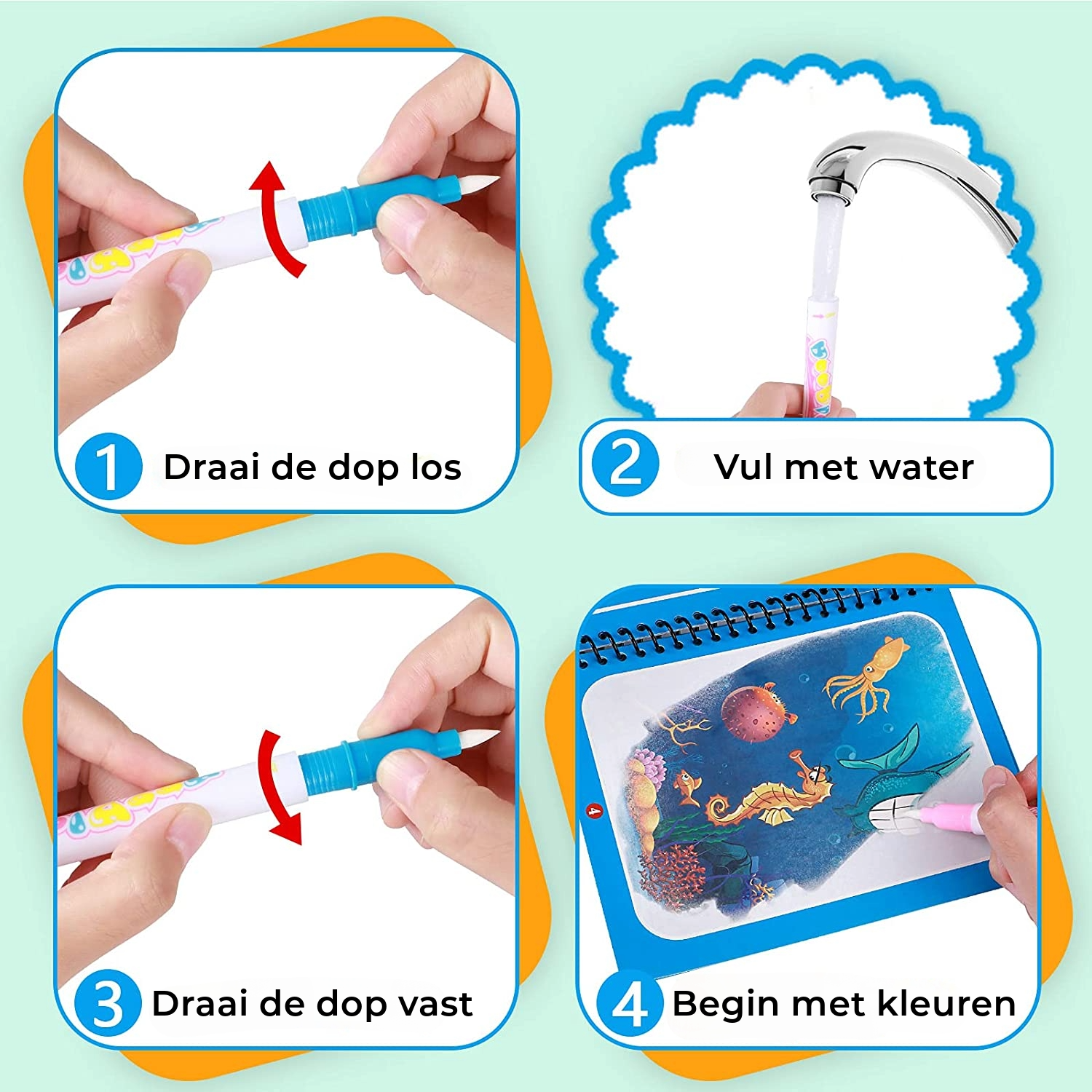 Zeg vaarwel tegen morsen en vlekken! Het Magisch Waterboek biedt een schone en rommelvrije manier voor kinderen om zichzelf uit te drukken. Vul gewoon de pen met water en laat de magie zijn werk doen.
