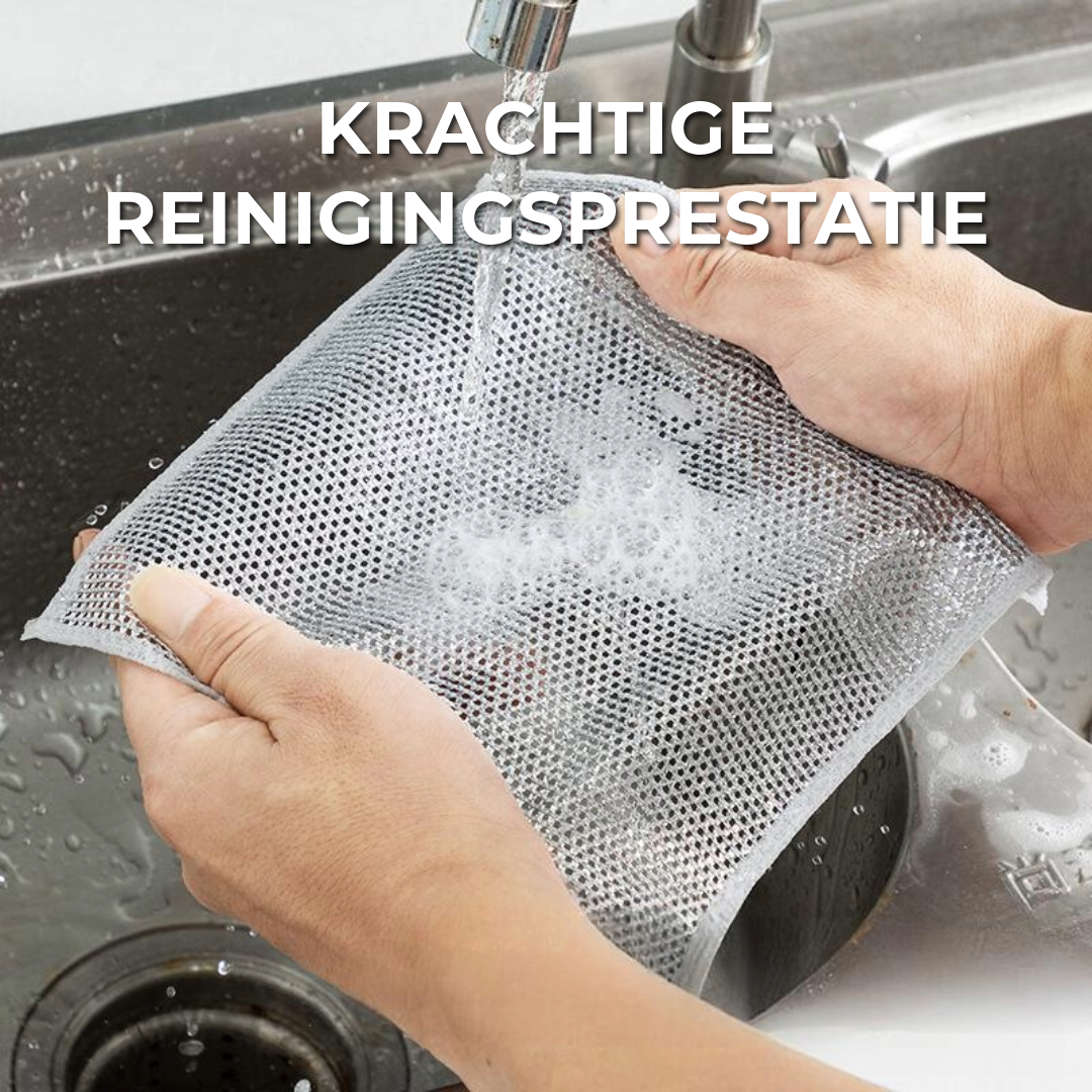 Dankzij de geavanceerde diamantvormige weeftechnologie en hoogwaardig polyester verwijdert deze doek moeiteloos roest, vet en hardnekkig vuil – zonder je handen of potten te beschadigen.