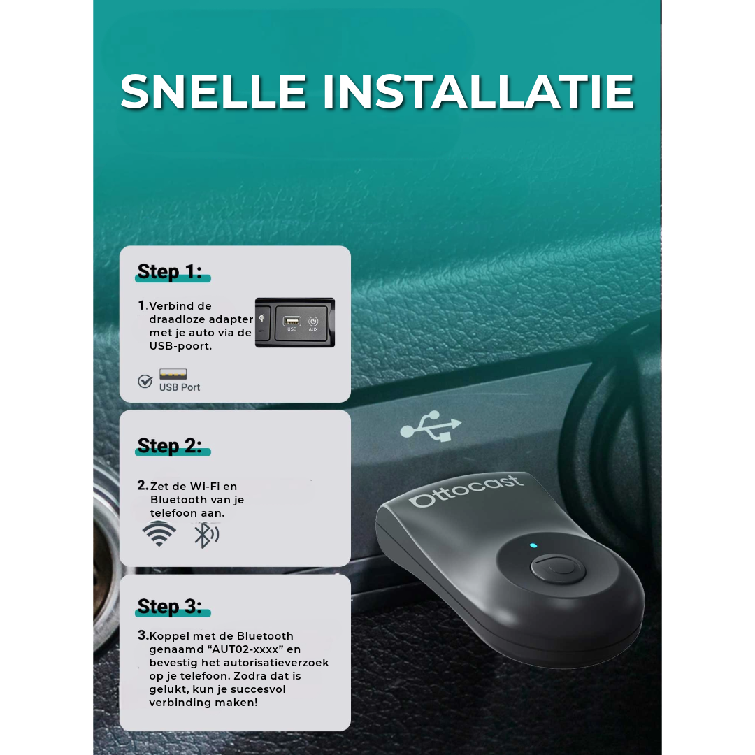 Sluit de adapter aan, verbind je telefoon, en klaar! Na de eerste keer verbindt het apparaat zich automatisch bij het starten van je auto. Eenvoudig, snel en stressvrij – je hoeft nooit meer je telefoon handmatig te koppelen.