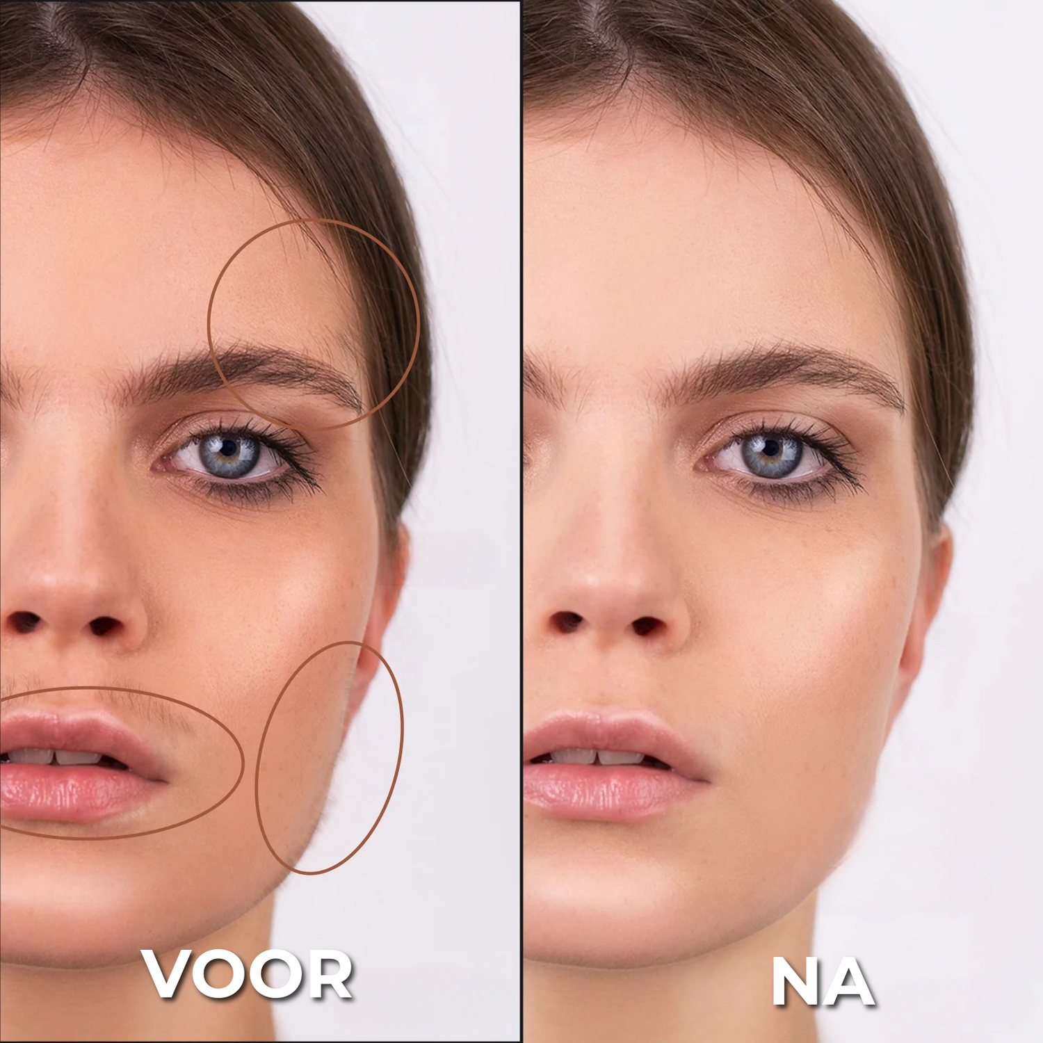 Met onze gezichtshaar verwijderaar zie je het verschil niet alleen op je huid, maar voel je het ook in jezelf. De ‘voor’ en ‘na’-foto’s laten een zichtbaar gladdere, egale huid zien, maar het echte verschil zit in hoe je je voelt. Weg met de onzekerheid over ongewenste haartjes, en hallo tegen een stralend, zelfverzekerd jij.