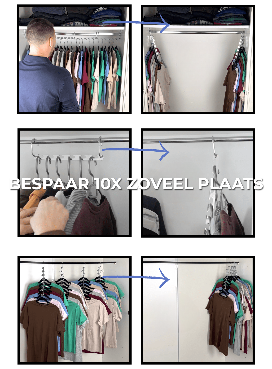 Dit innovatieve ophangsysteem maakt het mogelijk om tot 12 kledingstukken op te hangen in de ruimte van slechts 1 hanger. Maak direct ruimte vrij voor meer kleding of betere organisatie.