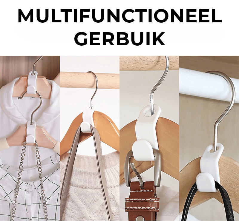 Dit innovatieve ophangsysteem maakt het mogelijk om tot 12 kledingstukken op te hangen in de ruimte van slechts 1 hanger. Maak direct ruimte vrij voor meer kleding of betere organisatie.