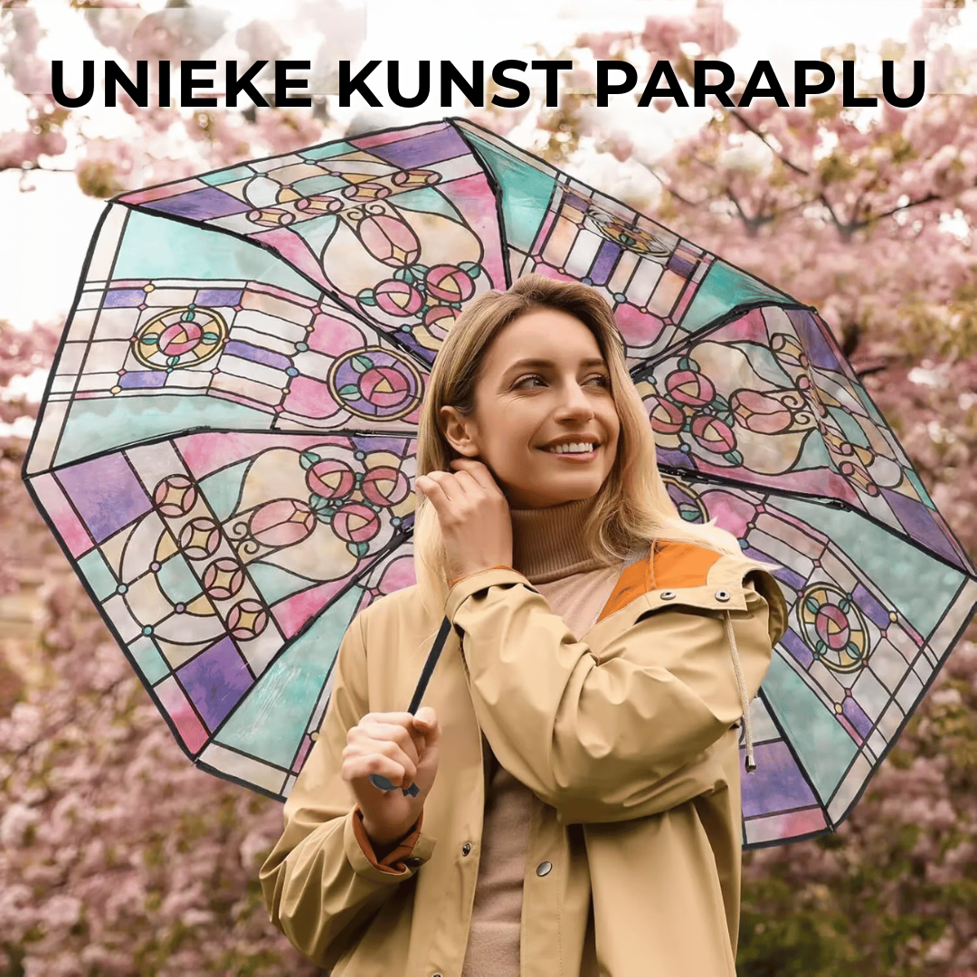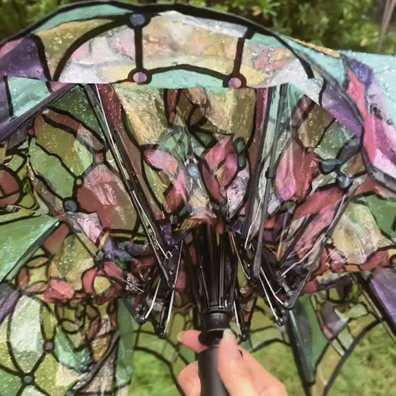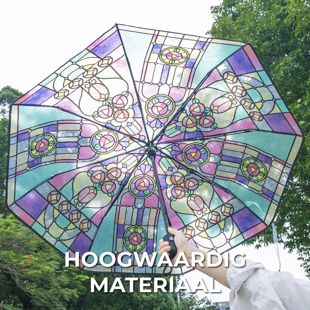 Deze vintage paraplu is meer dan een regenscherm – het is een bewegend kunstwerk. Het glas-in-lood geïnspireerde design creëert een betoverende, kleurrijke schaduw, waardoor elke regenachtige dag verandert in een stukje romantische poëzie. Laat je stijl stralen, zelfs als de zon dat niet doet.
